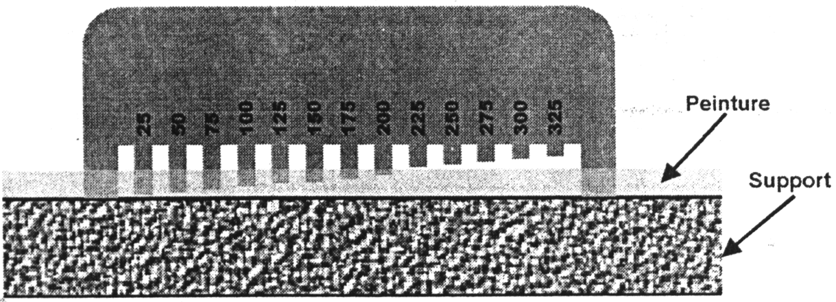 Grzebień pomiarowy, jaki zagłębia się w warstewce farby mokrej celem określenia wartości grubości warstwy nałożonej, w chwili, gdy warstwa ta będzie sucha. Bierze się po uwagę wartość mierzoną między ostatnim zębem grzebienia, który dotyka farby i ostatnim zębem, który jej nie dotyka. Mnoży się wówczas te wartości przez wyciąg suchy, co daje nam ocenę końcową spodziewanej grubości suchej. Przykład: ząb, który dotyka 200µ ząb, który nie dotyka 225µ Aby obliczyć ekstrakt suchy (patrz na kartę techniczną) o 50% otrzymamy 200µ x 50% = 100 µ warstwy suchej 250µ x 50% = 125 µ warstwy suchej Można, więc powiedzieć, że grubość warstwy suchej mieścić się będzie pomiędzy 100 et 112.5 µ. (patrz: rysunek).